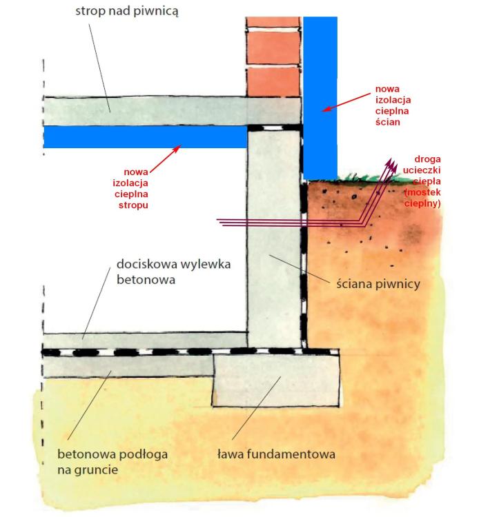 Tak jak pisałem, po ułożeniu izolacji cieplnej od poziomu gruntu w górę, efekt będzie całkiem niezły. Nie będzie jednak idealny, bo pozostanie ucieczka ciepła na drodze ściana zewnętrzna piwnicy - grunt. Chociaż moim zdaniem jest to do przyjęcia. Przecież i tak będzie o wiele lepiej niż obecnie. Natomiast izolowanie ścian piwnicy poniżej poziomu gruntu wymagałoby bez porównania większego nakładu pracy. Pracy trudnej i potencjalnie niebezpiecznej, polegającej na odcinkowym odkopywaniu fundamentów. Powtarzam, pozostanie mostek cieplny, ale moim zdaniem lepiej pogodzić się z jego istnieniem. Załączam szkic, pokazujący, którędy będzie uciekać ciepło.