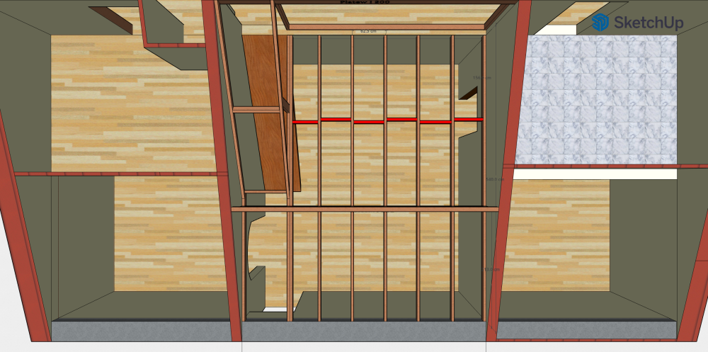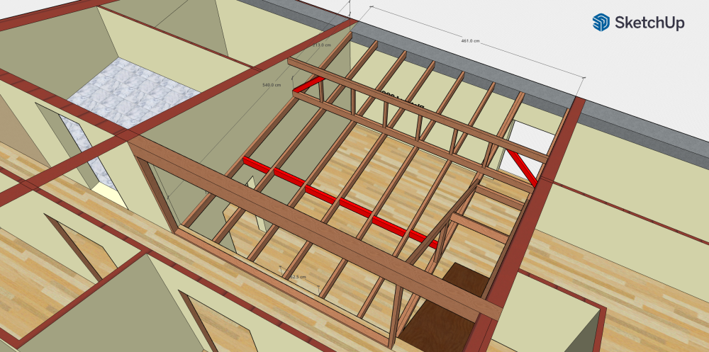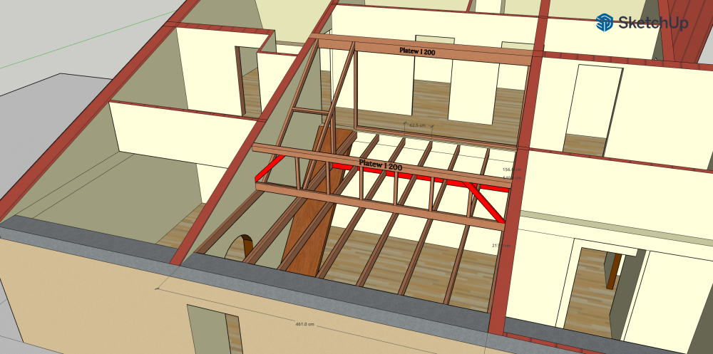Wysłałem również LINK do mojego projektu w SketchUp, gdzie możecie zobaczyć, jak sobie to wymyśliłem. Zaznaczyłem kolorem czerwonym rzeczy, których kompletnie nie jestem pewien, tj. rozpórki oraz skosy, które podciągają płatew do ściany. Chciałbym wiedzieć, czy to ma sens i co byście poprawili w moim projekcie.
