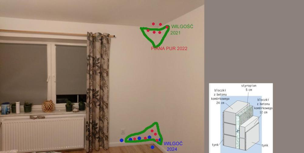 6. Witam wszystkich forumowiczów. Piszę do was z prośbą o radę, wskazówki co robić. Kupiłem dom z 2000r w którym jest problem z wilgocią w jednym pomieszczeniu. Mur domu stanowi 3-warstwowa ściana: sylikat, styropian 5cm oraz cegła. W 2010 wcześniejszy właściciel docieplał ścianę dodatkową warstwą styropianu (10cm), ale nic to nie dało. Rozległe, prawie na 20cm czarne plamy nadal powstawały w rogu pokoju (kolor zielony) Kiedy ja wszedłem w posiadanie nieruchomości, w 2022 zrobiłem remont: skułem tynki w zielonych miejscach, popsikałem płynem anty-grzyb, nawierciłem otwory w murze i pomiędzy mur wytrysnąłem piankę niskoprężną (czerwone punkty). Problem wilgocią rozwiązał się w górnym narożniku, ale w dolnym już nie. Niebieskie punty pokazują gdzie wychodzi nadal wilgoć (wielkości 1-2cm) zdjęcie z dzisiaj 06.11.2024. Pokój jest wietrzony i ogrzewany. W łaziance i w garderobie jest kratka wentylacyjna. Na szybach natomiast po nocy regularnie skrapla się woda, na parapecie potrafią powstawać małe kałuże na ok 5cm. Pomyślałem, ze warto zainwestować w nawiewniki do okien. W przyszłym tygodniu je zamontuję. Ale myślę ,że to tylko mała cegiełka do rozwiązanie przyczyny wilgoci. Gdzie waszym zdaniem może leżeć przyczyna zbieranie się wody w murze? Problem czarnych plam w dolnym narożu był już lekko widoczny zimą 2023. Ale sądziłem że to efekt niedosuszonej ściany i z czasem sam zaniknie po przecieraniu środkiem do pleśni. W