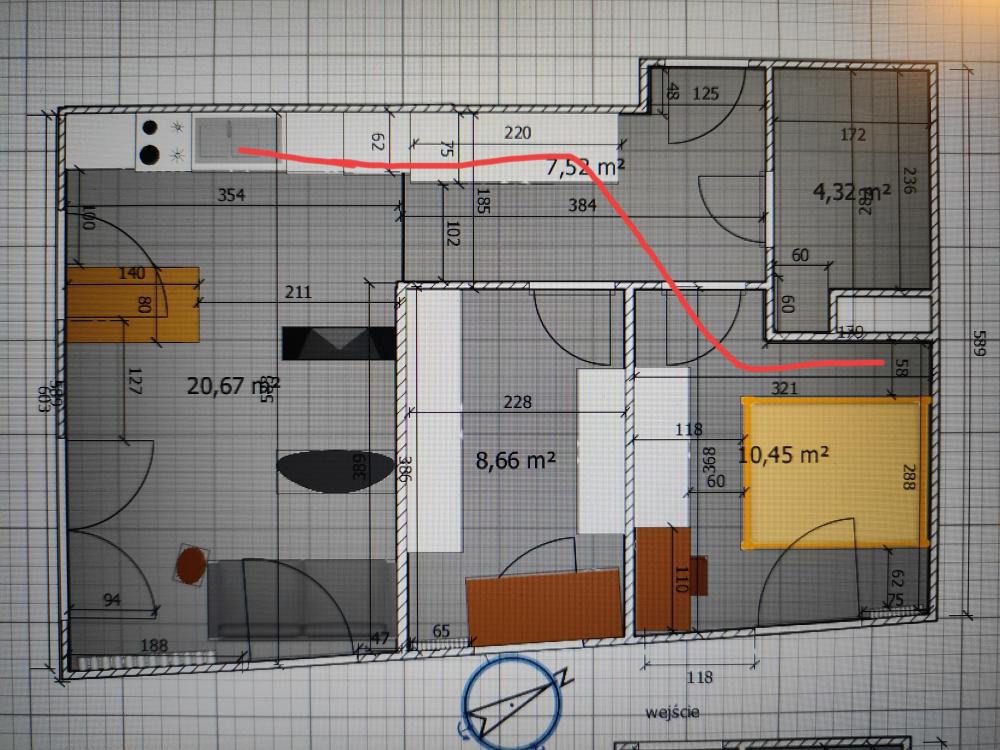 Otóż do przenosząc kuchnię oddałam się od pionu o jakieś 10m. Mam dziurę na okap oraz osobną na grawitacyjną. Przeniesienie okapu nie powinno być problemem - mocniejszy wyciąg i prostokątny profil o odpowiednim przekroju ale nie wiem jak sprawa się ma z wentylacją grawitacyjną. Planuję zrobić podwieszany sufit w całym mieszkaniu. Gotowanie na indukcji, w oknach wszystkich są napowietrzniki. Czy to wystarczy ze względów formalnych i użytkowych czy też plan nie wypali? Załączam poglądowe zdjęcie