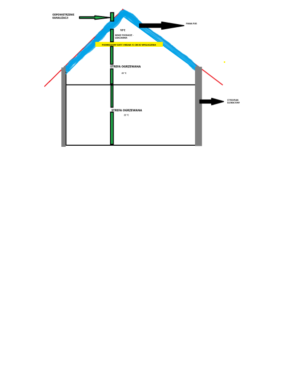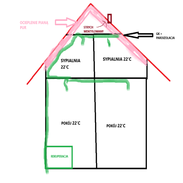 6. Hej, Układ jak na zdjęciu, na ogrzewanym parterze i piętrze 22°C a na ocieplonym, nieogrzewanym, niskim stryszku 10°C. Na zielono zaznaczyłem pion odpowietrzenia kanalizacji (nie ma tam innych rur bo w domu jest rekuperacja), rury idące do odpowietrznika w dachu są nieocieplone i obecnie bardzo zimne, czy to powoduje obniżenie temperatury na poddaszu? Czy powinienem je zaizolować między pianą pur a powieszonym sufitem na którym jest wełna wygłuszająca?