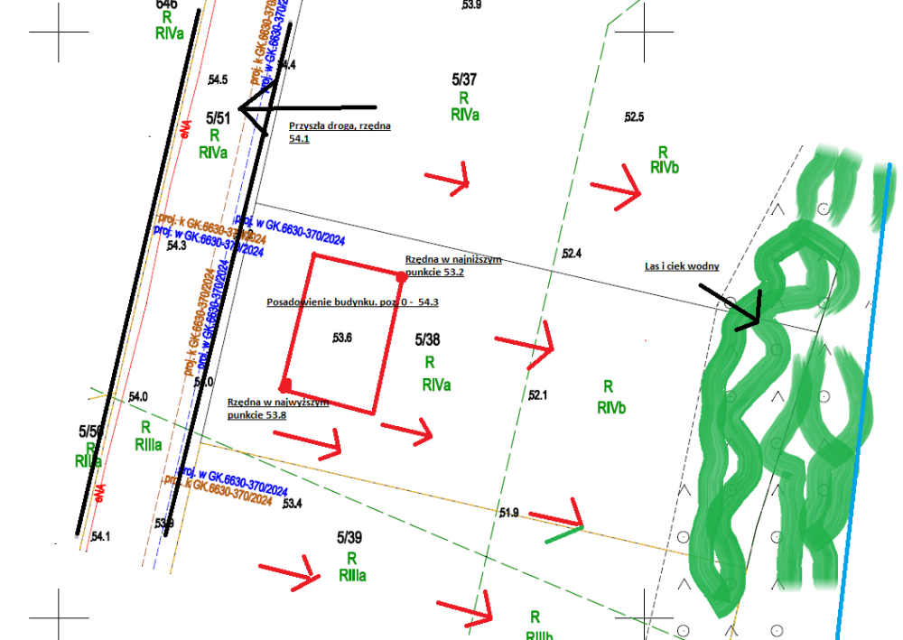 1. Dzień dobry Drodzy Forumowicze! W tym sezonie planuje rozpoczęcie budowy swojego domu i mam pewien dylemat, którym chciałbym się podzielić oraz poprosić o rady. Otóż działka, na której stanie dom ma spory spadek w kierunku cieku wodnego znajdującego się w sąsiadującym ze mną lasie, w związku z czym poziom terenu jest niższy niż pozostałe domostwa po drugiej stronie ulicy. Projekt drogi dojazdowej zakłada rzędną 54.1. Na tej podstawie mój Projektant wyznaczył rzędną "0" na rzędnej 54.3, załadając 0.5m schodów. W związku z czym poziom terenu po niwelacji, będzie na rzędnej 53.8 (30cm poniżej planowanej drogi) Rzędna najbardziej wysuniętego punktu do lasu (najniższy punkt) to obecnie 53.2 Założenie przewiduje ławy fundamentowe. Jak widzicie, teren będzie musiał zostać mocno podniesiony, ława fundamentowa w najniższym punkcie terenu będzie posadowiona płytko, na głębokości 40cm (grunt nośny) a potem teren będzie obsypany ziemią (z pobliskiej budowy drogi szybkiego ruchu także materiału gliniastego jest sporo). Obawiam się jednak, iż podniesienie terenu do rzędnej 53.8 i tak będzie powodował zalewanie terenu. Czy powiedzmy zniwelowanie terenu dookoła posesji z 2% spadkiem w strone lasu wystarczy, żeby uniknąc problemu? Dodam, że projektant przewidział drenaż fundamentów. Czy widzicie tutaj ryzyka, którym powinenem się bardziej przyjrzeć? Działki sąsiadujące są na razie puste. Będę bardzo wdzięczny za rady. Pozdrawiam