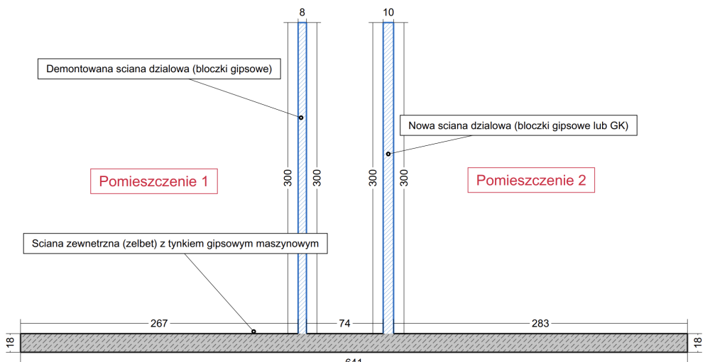1. Dzień dobry, W mieszkaniu chciałbym przenieść ściany działowe. Dla uproszczenia niech będzie to tylko jedna ściana działowa, dołączyłem grafikę. Prace chciałbym komuś zlecić, bo się na tym nie znam, ale samemu najpierw chciałbym zrozumieć problemy. Proszę o pomoc. W standardzie deweloperskim wykonano: - ściany działowe z bloczków gipsowych (multigips) 8 cm. Są one już oszpachlowane (do poprawy). Nie trzeba było ich tynkować. - jastrych cementowy zatarty na gładko. Jeden poziom w całym mieszkaniu. Zapewne są dylatacje obwodowe w każdym pomieszczeniu i inne dylatacje techniczne (np. salon jest długi więc pewnie będzie przecięty w połowie itp.). - tynki gipsowe maszynowe na żelbetowych ścianach zewnętrznych mieszkania oraz na suficie. Z tego co rozumiem, po usunięciu ściany działowej, powstaną pasy: - Bez jastrychu pod ścianą, - Bez tynku nad, - Bez tynku na zewnętrznej ścianie żelbetowej. Oprócz tych pasów, jeszcze może się okazać, że pomieszczenia A i B mają różne głębokości tynków na ścianach/stropie. Posadzka powinna być niby taka sama. Tynki: Jak sobie poradzić z uzupełnieniem tynku na suficie i ścianach? Jakiego materiału użyć? Jak się postępuje w przypadku wyrównania grubości tynków pomiędzy pomieszczeniami? Może lepiej wyjdzie ten sufit zabudować płytami GM (nie robię obniżanego sufitu)? Jastrych: Czym uzupełnić pas pod ścianą działową? Czy ta łata powinna mieć dylatacje obwodową? Czy jak jastrych już wyschnie, to może go zszyć razem z posadzką pomieszczenia A? A może trzeba skuć całą posadzkę i na nowo zrobić? Docelowo planuję klejoną deskę. Nowa ściana multigips lub GK: Nie mogę jej stawiać bezpośrednio na jastrychu, bo akustyka będzie kiepska i się drgania będą przenosiły pomiędzy pomieszczeniami. Trzeba skuć pas pod ścianę, postawić ścianę, a później poprawić posadzkę? Dzięki za zerknięcie na to!