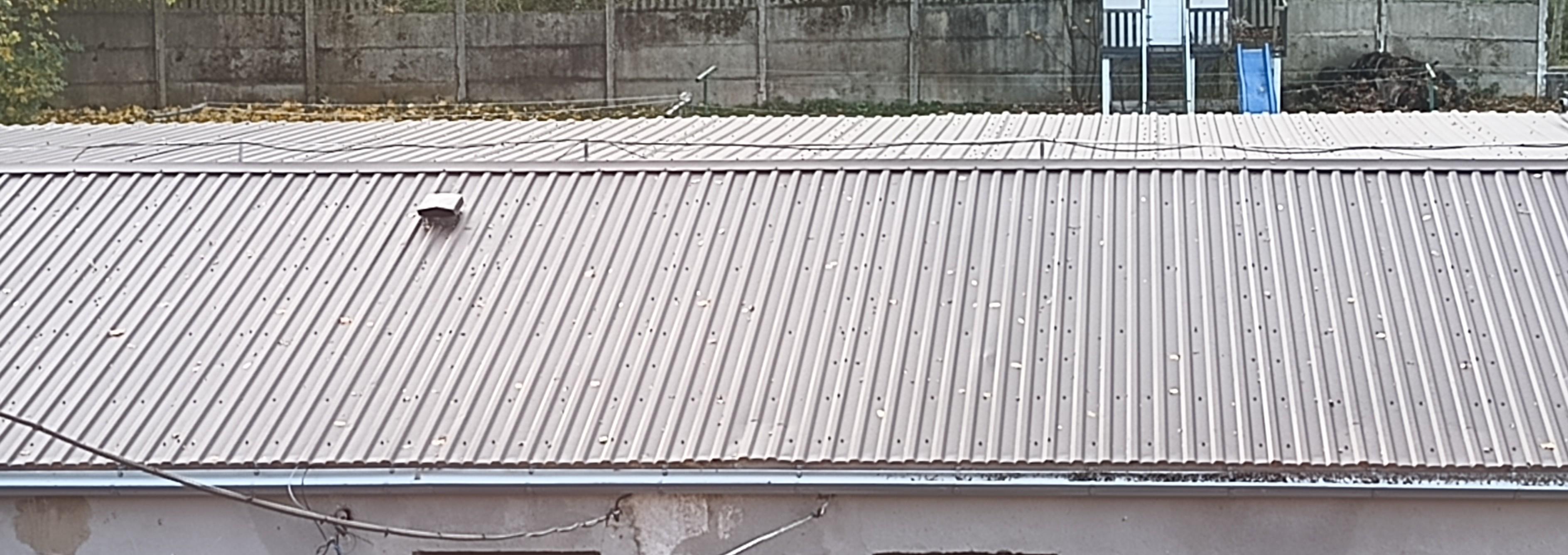 Firma która wymieniała poszycie postarała się żeby jak najbardziej zminimalizować wentylację dachu. Filc oczywiście nie został usunięty z żadnej strony. W części okapowej firma na murze dawała zaprawę betonowa i na tej zaprawie leży blacha. Skutkiem jest brak nawet małej szczeliny ponieważ profil blachy wypełnia beton.